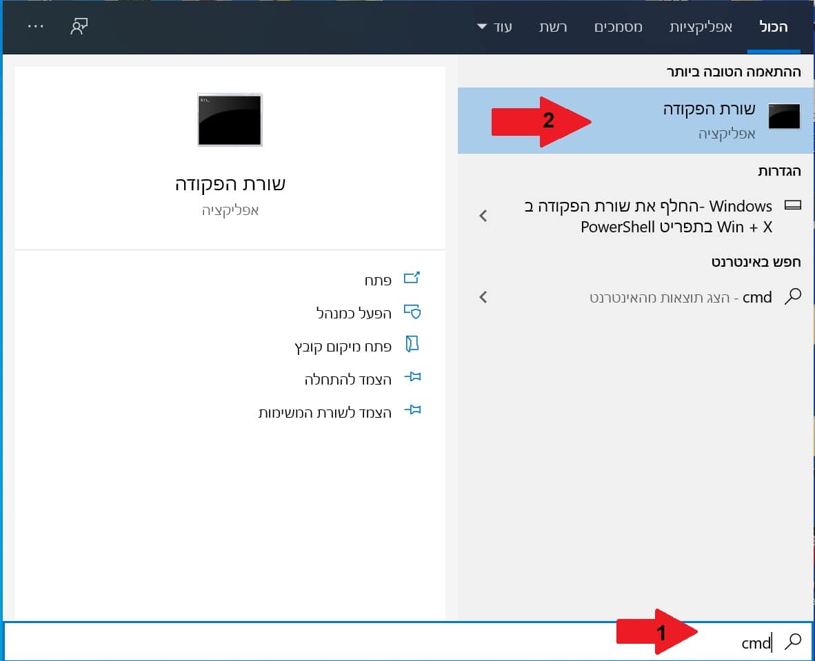 1. ניכנס להתחל, או לחיפוש ונרשום cmd. תופיע תוכנית בשם שורת הפקודה (Command Prompt אם יש לכם מערכת באנגלית).