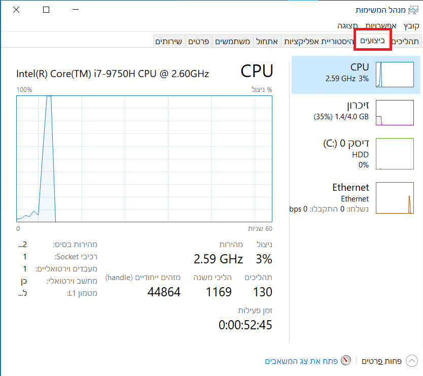 ניכנס ללשונית ביצועים ונוכל לראות מידע על הרכיבים הבאים: