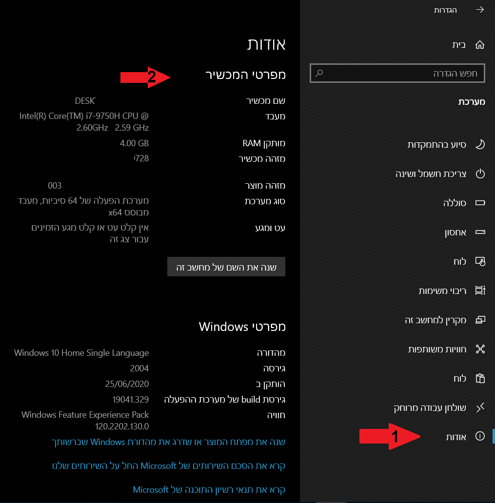- בדיקת המפרט של המחשב דרך הגדרות.