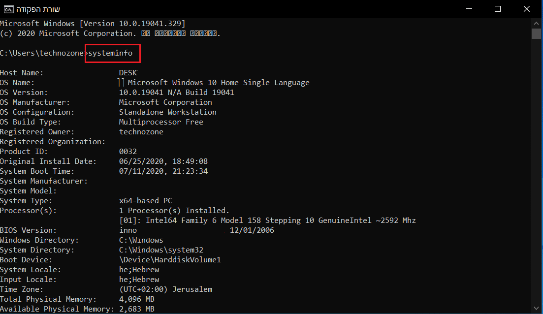 כדי לבדוק את מפרט המחשב דרך שורת הפקודה בצעו את השלבים הבאים: