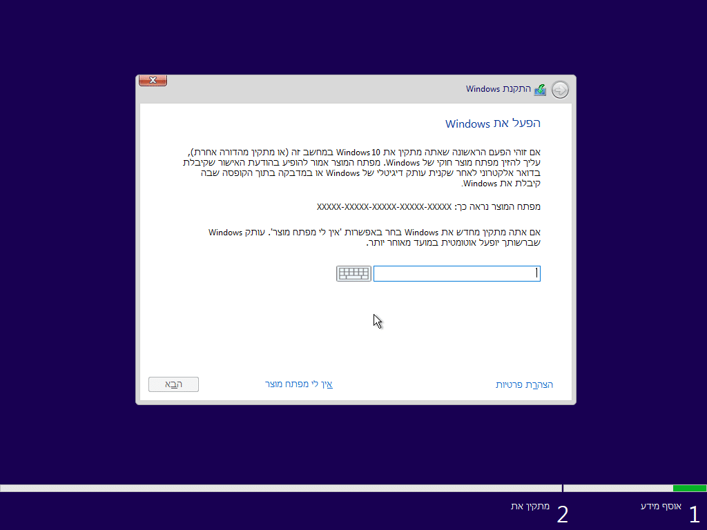 4. במסך הבא נתבקש לרשום מפתח מוצר. אם יש ברשותכם מפתח מוצר נרשום אותו, ולאחר מכן נלחץ הבא.