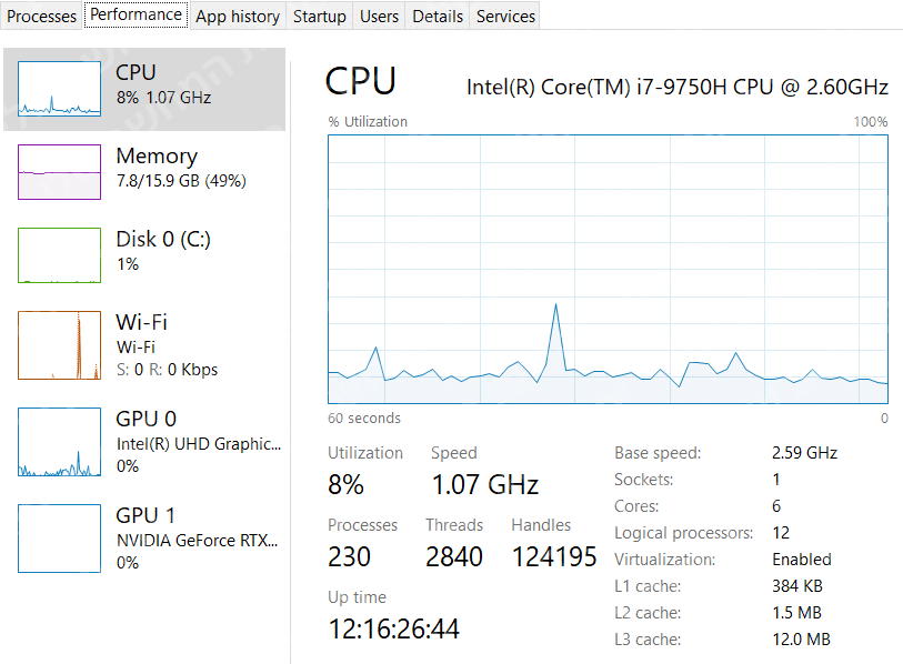 בלשונית ביצועים ניתן לראות את השימוש במשאבי המערכת כמו המעבד, זיכרון כרטיס מסך, רשת וכו'